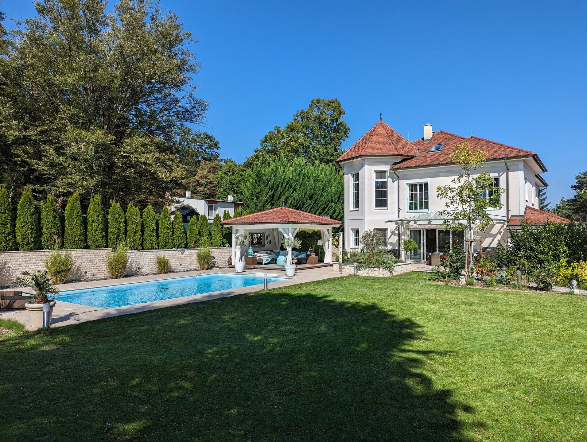 | Tags: | Arbeitszimmer, Außenansicht, Badezimmer, Eingang, Esszimmer, Galerie, Garage, Garten, Kinderzimmer, Küche, Nahe Wien, Nebengebäude, Pavillon, Pool, Schlafzimmer, Terrasse, Treppe, Vorzimmer, Wellnessbereich, Wohnzimmer |